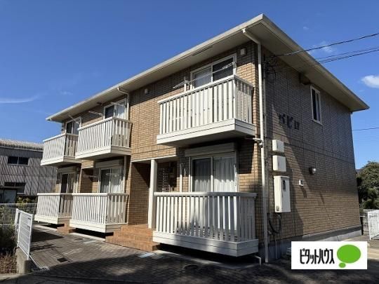 ピンクの外観が映える池谷駅近く・2階角部屋・2LDK。浴室乾燥機、追焚機能、温水洗浄便座付。藍住町へのアクセス良好。