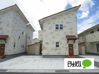 駐車場2台可・珪藻使用のエコ住宅で、オシャレな外観です。1坪タイプバス、エアコン2台、TVドアホン付き。専用倉庫があり、自転車や季節の家電収納できます。隣と引っ付きすぎていない配置も魅力です。